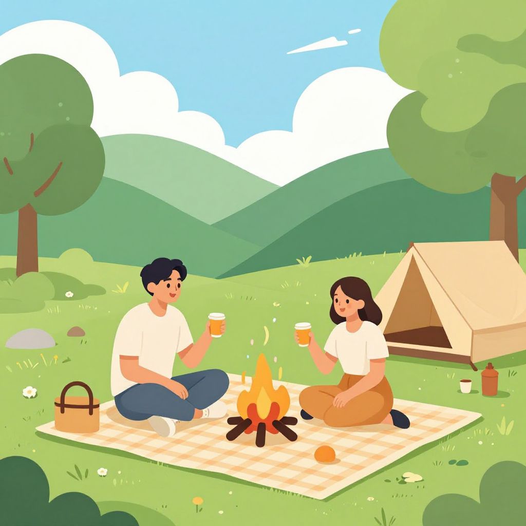 Digital illustration of a sunny outdoor camping scene. A young boy with short brown hair, wearing a white shirt and brown pants, sits cross-legged on a checkered blanket next to a girl with long black hair, dressed in an orange dress. They sit near a small campfire with a bright orange flame, surrounded by rocks and orange peels. A beige tent stands to the right, with green hills and trees in the background. The sky is blue with white clouds, and the grass is bright green, dotted with small flowers. The style is colorful and cartoonish.