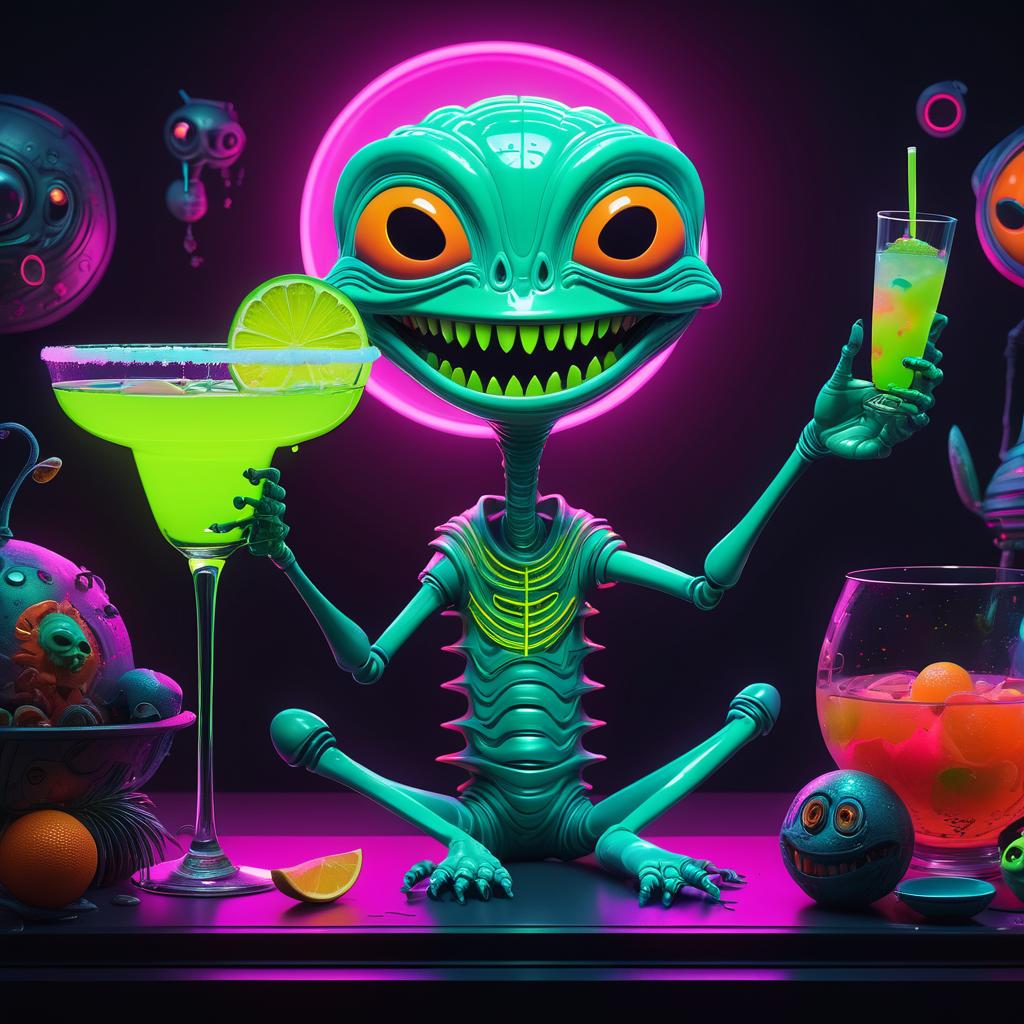 Neon art, a quirky alien with a wide smile wearing a pulpy margarita glass, surrounded by assorted strange objects, inspired by Ryan Trefry, creating a captivating visual narrative, 4K, ultra-detailed, expressive brush strokes.