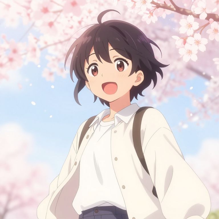 Shy cute anime boy standing in a sunlit school corridor, blushing with a soft smile, wearing a casual uniform, delicate pastel color palette, detailed eyes sparkling with innocence, gentle background with cherry blossom petals drifting, soft shading.