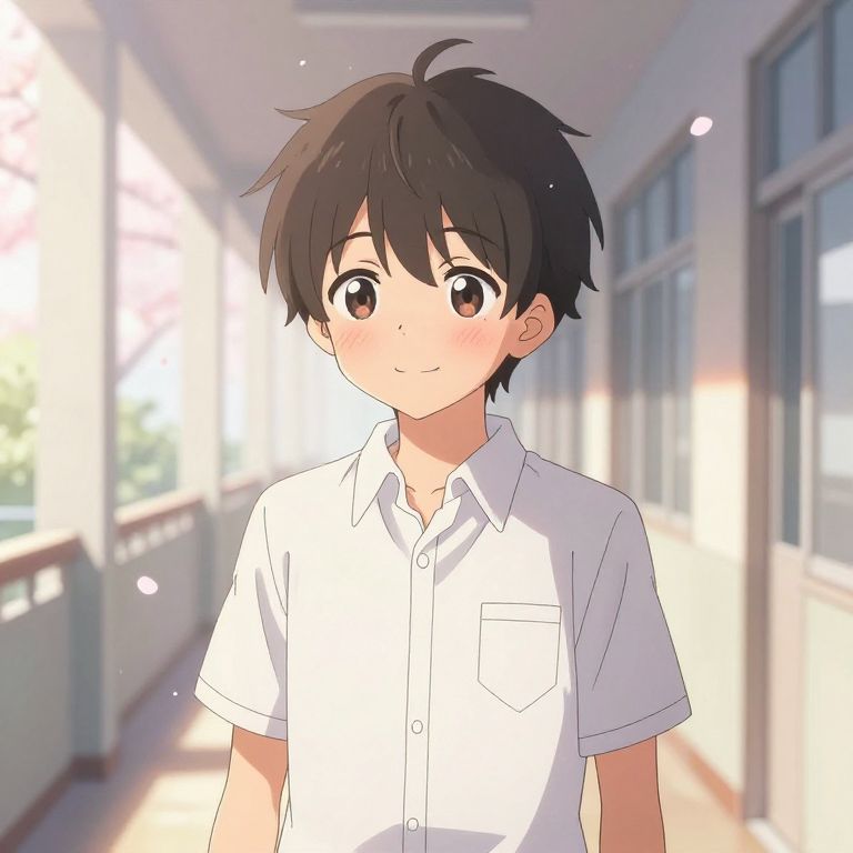 Shy Anime Boy in Sunlit Corridor
