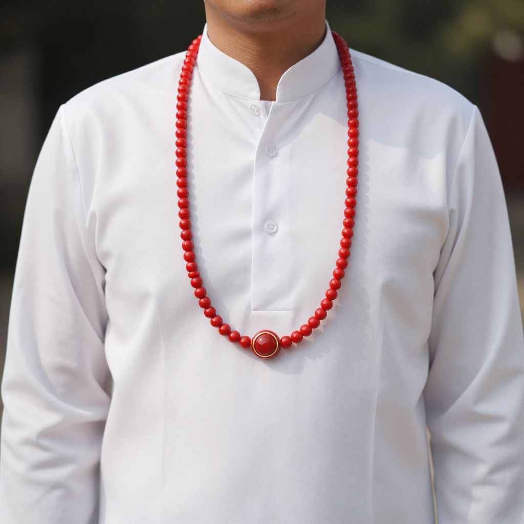 Photograph of a man from the chest to the top of his head, wearing a crisp, white, long-sleeved button-up shirt. He has a medium brown skin tone and is adorned with a vibrant red bead necklace featuring a circular red pendant in the center. The background is blurred, with indistinct dark green and brown hues, suggesting an outdoor setting. The man's face is partially visible, with no visible facial hair, and his shirt is neatly buttoned. The contrast between the white shirt and red necklace is striking.