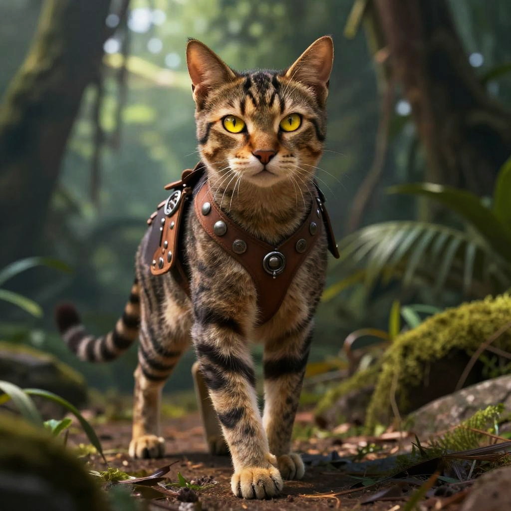 Tabaxi description showing a graceful feline explorer, mid-leap in a dense jungle, spotted fur pattern, dynamic lighting, tribal tattoos, carrying ancient scrolls, fantasy digital painting