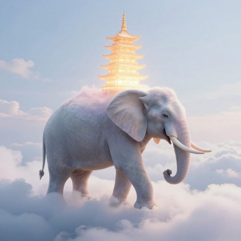 Serenity and transcendence intertwine as an ethereal elephant, cloaked in soft clouds, carries a luminous pagoda atop its back, symbolizing the delicate balance between earthly presence and celestial aspiration.