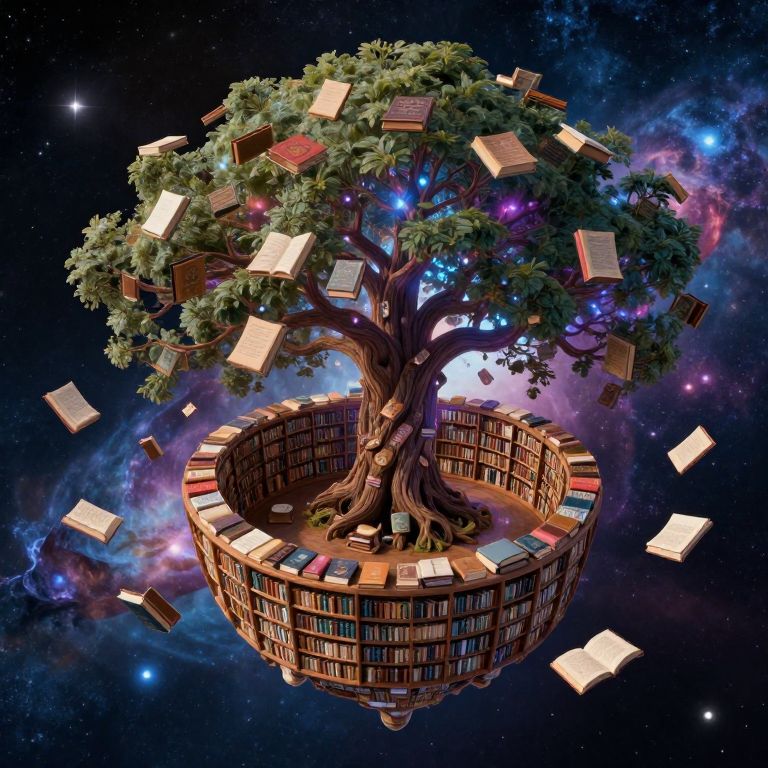 Fantastical digital art of a floating tree with books floating around it, surrounded by a circular library in space.