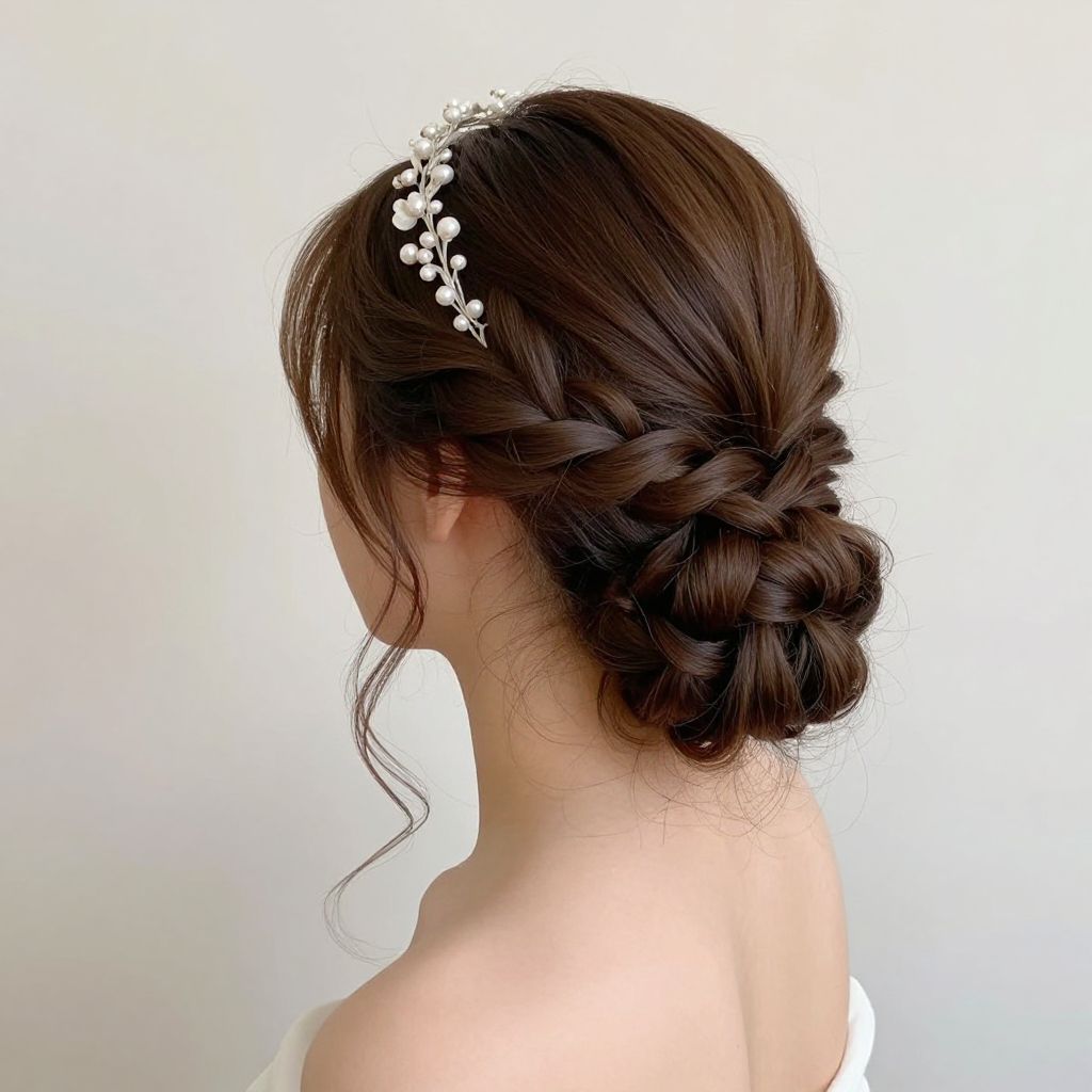 Elegant bridal hairstyle featuring a low, intricately braided bun adorned with a delicate floral headband, complemented by loose, wavy tendrils cascading down the shoulder.