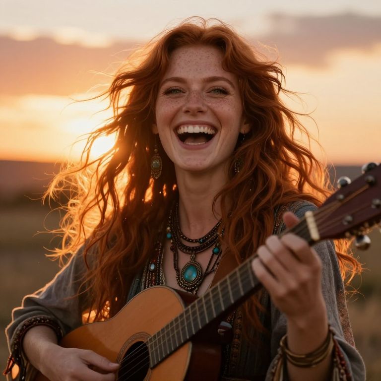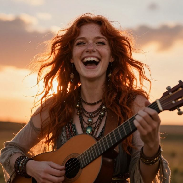 Ultrarealistic portrait of a captivating bard with flowing auburn hair and tender light green doe eyes ablaze with intense passion, a splash of freckles across her nose and cheeks, holding an enigmatic yet fiery gaze that captivates the viewer, She is laughing heartily, her wide-open smile radiating pure joy, with her eyes crinkling at the corners, and her head slightly tilted back in a moment of blissful joy, The bard plays an enchanting melody on her lute as sunlight streams through her flowing hair, creating an atmopheric perspective, Sparkling particles dance in the warm golden hour rim light, She wears boho dress with chunky gypsy style jewlelery that shimmer in the light, complementing the hues of the sunset sky, Capture the scene from a 'worms-eye view' perspective to enhance the sense of wonder, This portrait emphasizes the intensity of her joy, where the interplay between light and shadow magnifies the vibrant energy in her expression and the intricate details of her complexion, creating an emotional gradient that suggests time has paused to listen to the bard's timeless tale, style of Miles Aldridge, Beauty, realism, rays of light, play of shadow and light