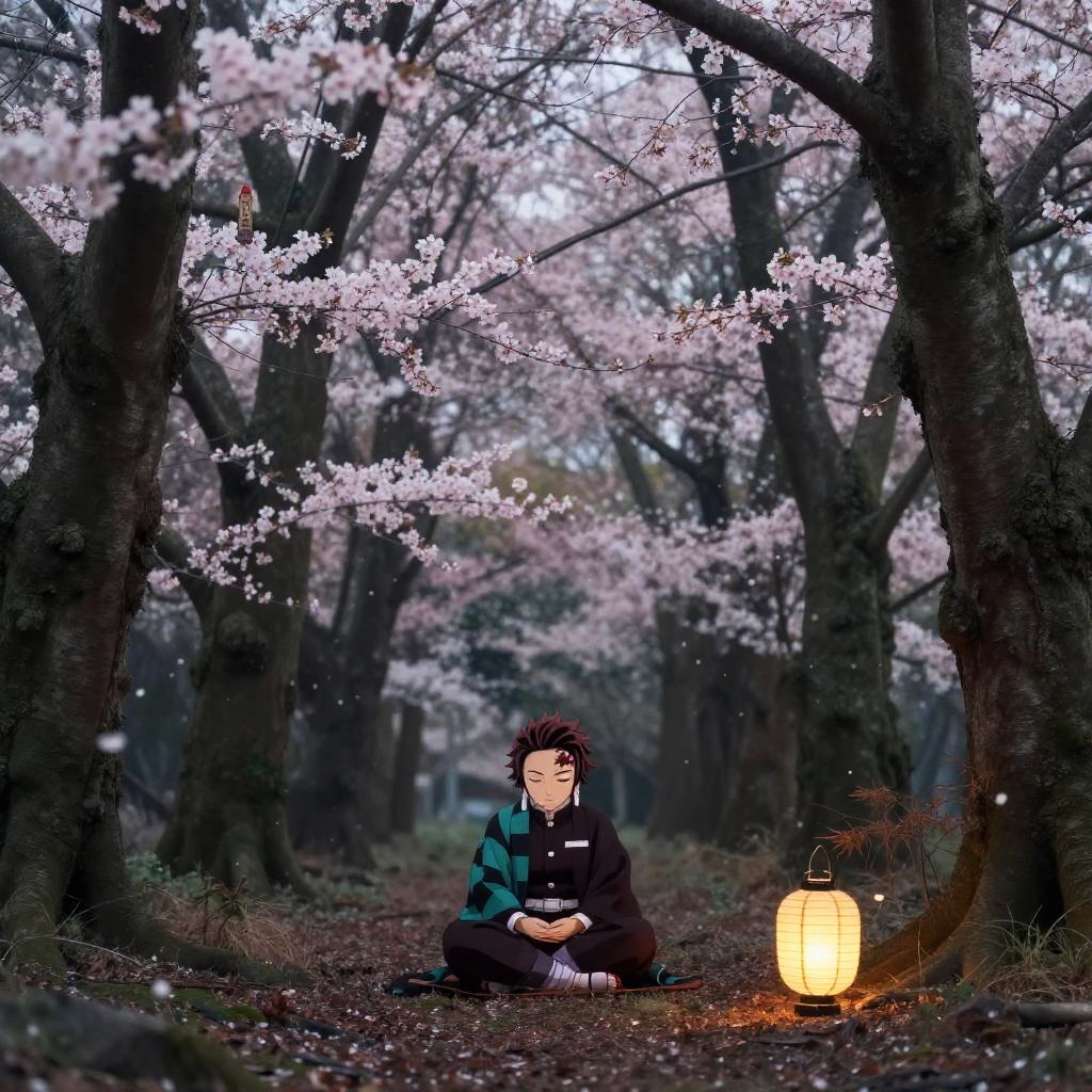 Demon Slayer forest, serene yet eerie atmosphere with cherry blossoms swirling through the air, soft glowing lanterns hanging from branches, a lone slayer meditating silently