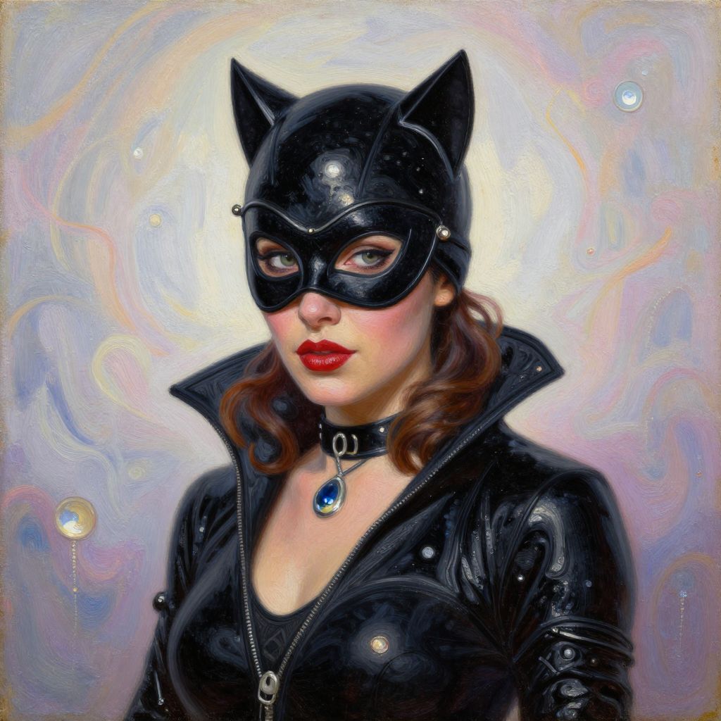 A captivating oil painting of Catwoman in a black outfit with intricate details, featuring a mask, charming hair, and a mysterious, spiritual atmosphere, reminiscent of the styles of Daniel Gerhartz and Krenz Cushart, with pastel colors and pearlescent elements.
