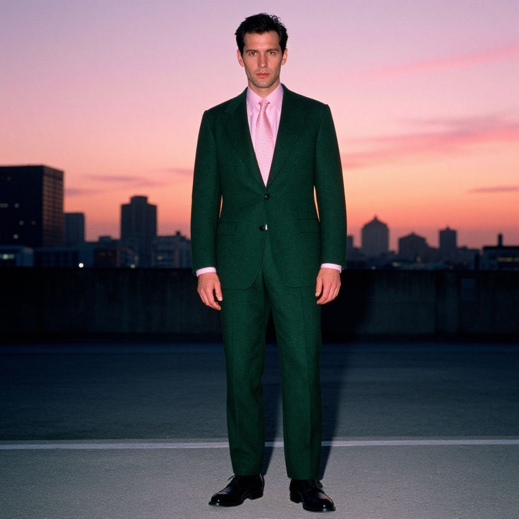 A man, deep green wool blend suit, modern cut, shawl lapels, pale pink dress shirt, textured silk tie, black leather derby shoes, urban skyline backdrop, vibrant sunset hues, AgfaColor film, confident expression Man has masculine face and piercing eyes