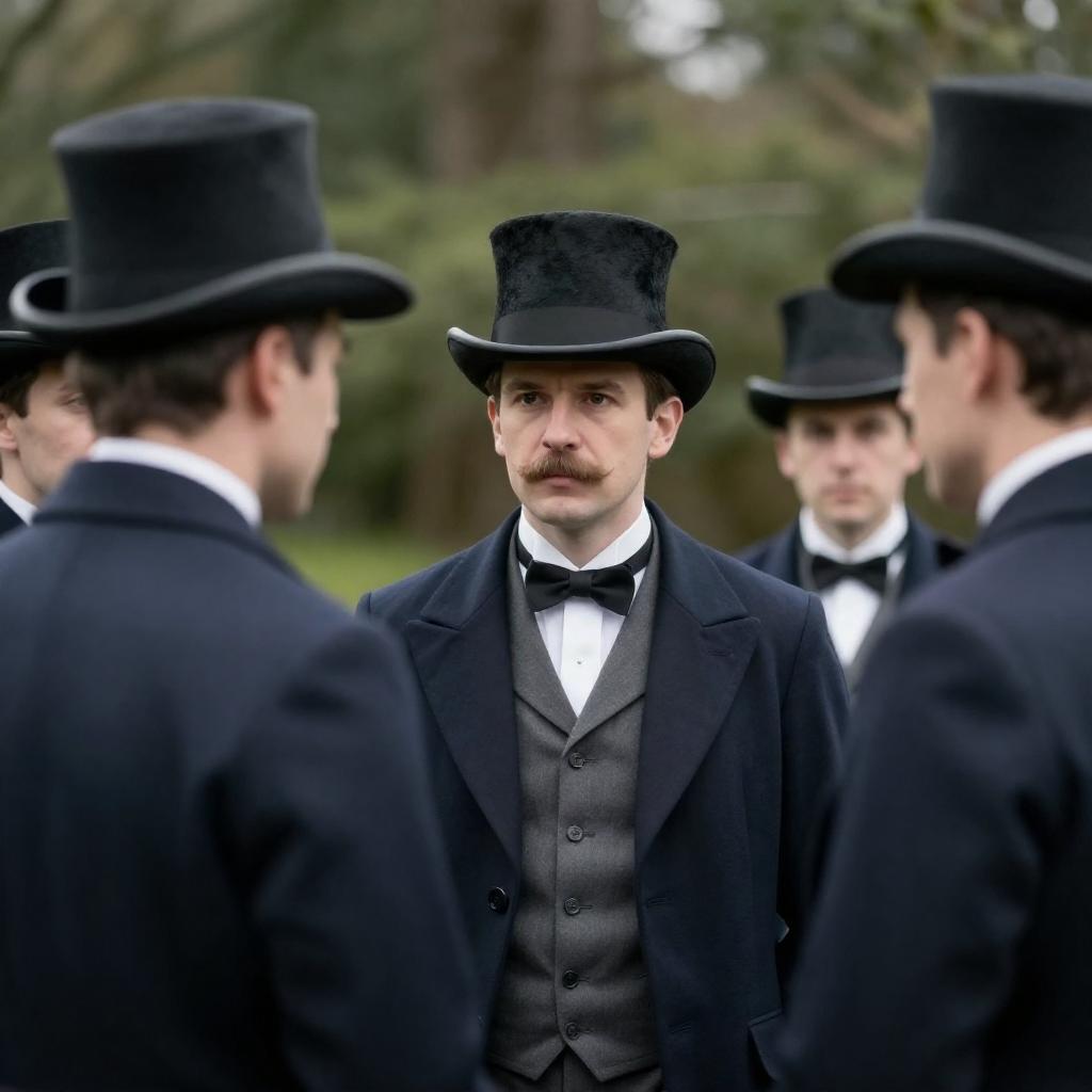 Photograph of a Victorian-era bar scene with six men in dark, formal attire and hats. Central figure, seated and wearing a brown suit and hat, looks down. Barman in white shirt and black vest stands behind the wooden bar, surrounded by bottles and a large copper jug. Two men on the left and right sit, while two others stand, engaging in conversation.