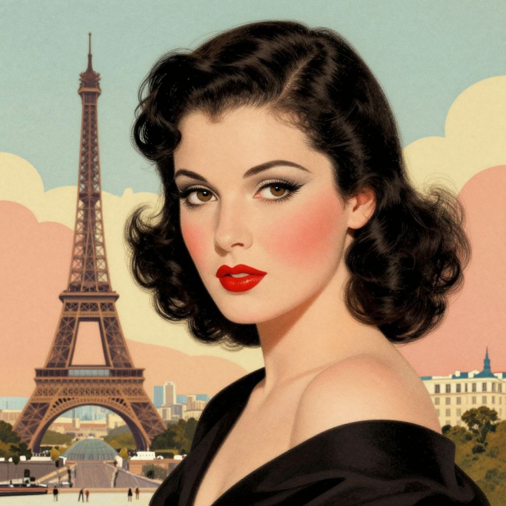 A vintage 1930s-style illustration featuring a glamorous woman with dark, wavy hair, bold red lipstick, and rosy cheeks, set against a stylized Parisian skyline with iconic landmarks, rendered in a retro, high-definition digital art style reminiscent of classic French advertising and cover art.