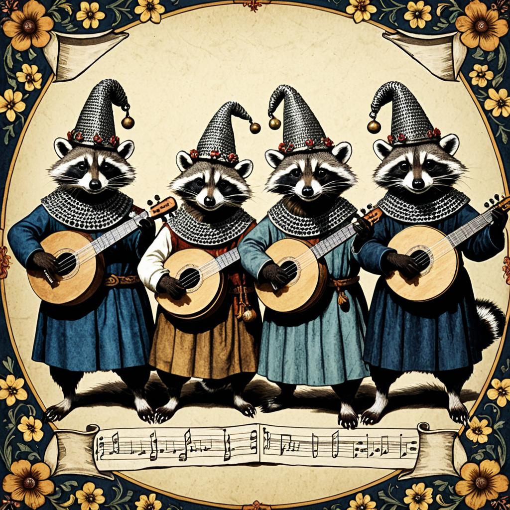 Illustration of a quartet of raccoons dressed as medieval minstrels wearing chainmail hats and tunics, playing lutes. The image is styled as an illuminated manuscript with floral decorative borders and vellum texture, blending whimsical and nostalgic medieval art influences.