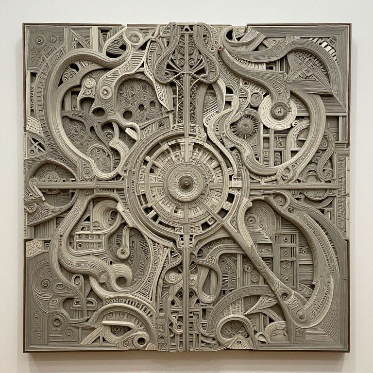 Intricate, metallic, digital relief sculpture featuring swirling, mechanical patterns with gears, spirals, and circular motifs, in shades of silver and gray