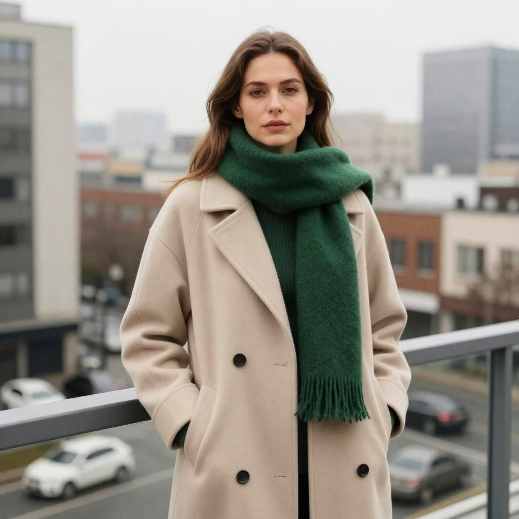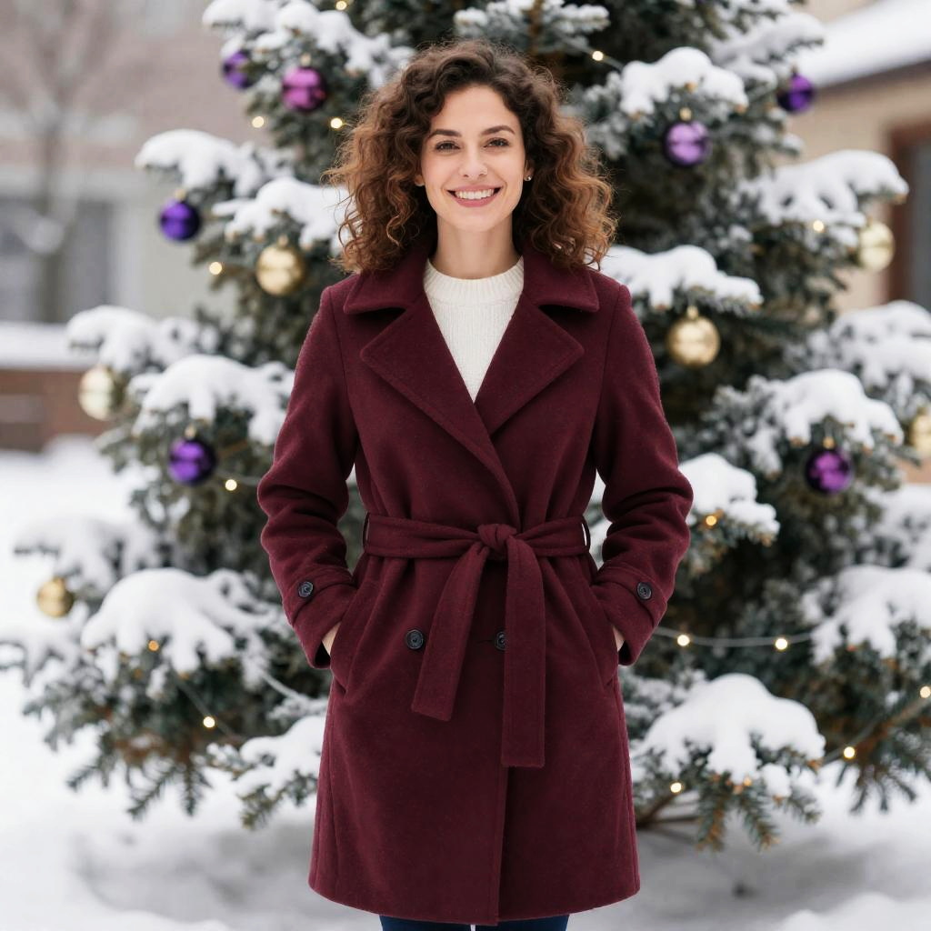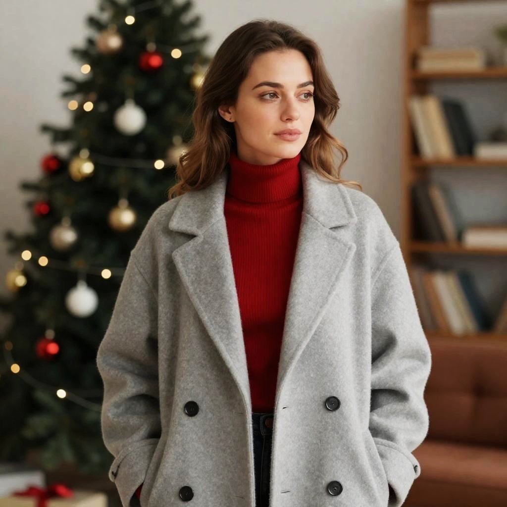 Woman with long brown hair, wearing a dark green leather jacket and white scarf, standing near a window display. Christmas decorations, including a small tree and red and green ornaments, in the background. Red poster with white snowflakes on the left. Her expression is calm and slightly smiling. Window has multiple panes. Indoor setting.