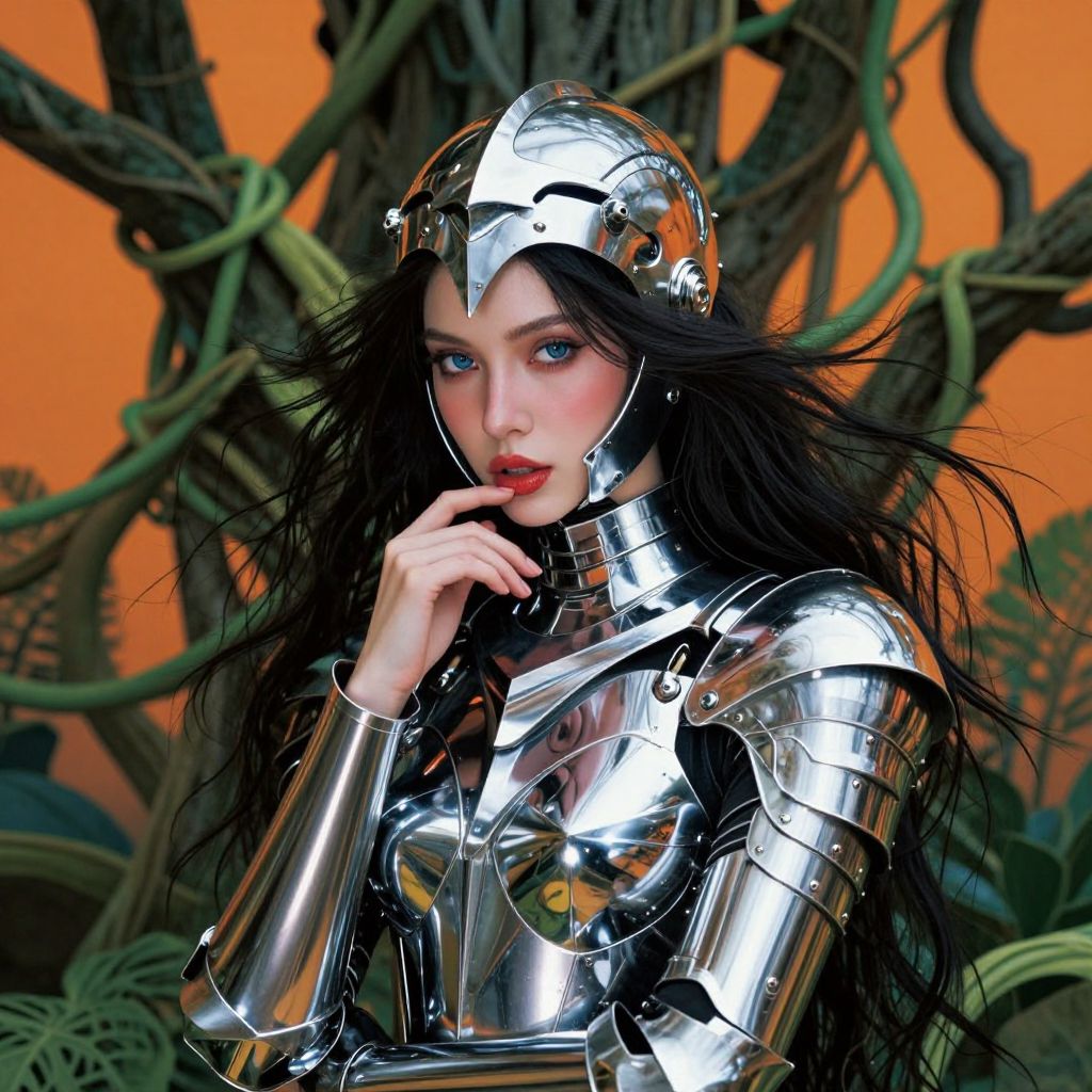 Ethereal Woman in Futuristic Chrome Nun Attire