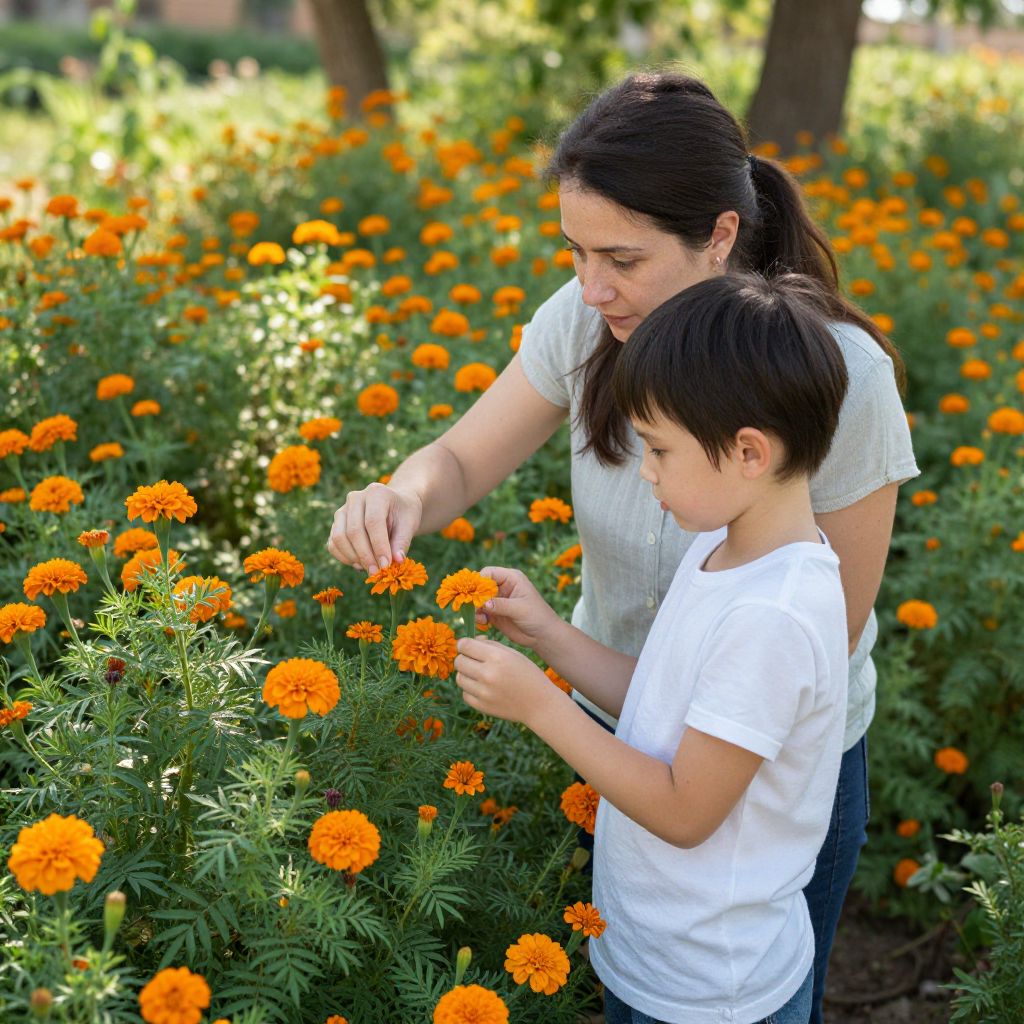 Two individuals, a woman and a child, stand amidst a vibrant field of orange marigolds, gently holding and examining the flowers as they share a quiet moment surrounded by lush greenery and dappled sunlight.