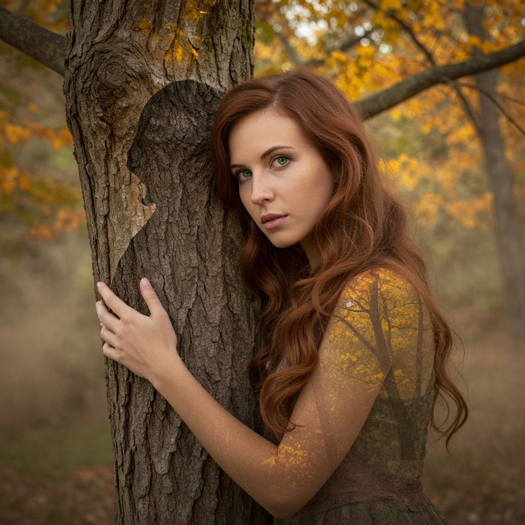 Envision a captivating portrait of a woman in her mid-thirties with striking green eyes and cascading chestnut hair, gently embracing an ancient tree's silhouette as if they were one. Her serene expression hints at untold tales, mirroring the vibrant autumn foliage and soft golden light filtering through the canopy above. The rugged bark merges seamlessly with her skin, forming a living mosaic that underscores their deep connection to nature. A delicate mist swirls around them, blurring reality and enchantment while emphasizing the magical synergy between human and forest in this dreamlike double exposure portrait.