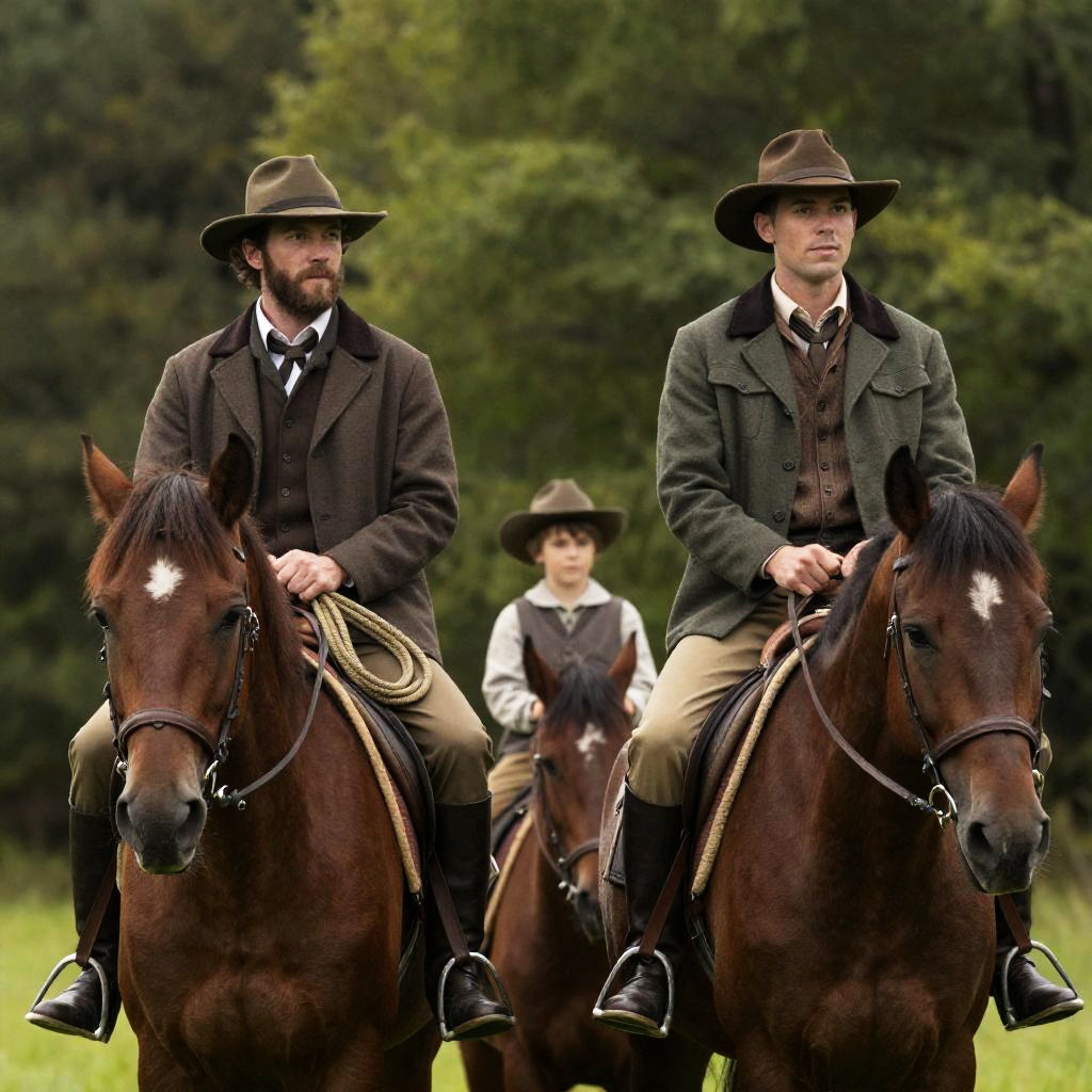 Three people riding brown horses in a forest. The man on the left has a beard, wears a brown hat and jacket, holds a coiled rope. The man on the right wears a brown hat and green jacket, looks forward. A child between them looks ahead. Green trees in the background.