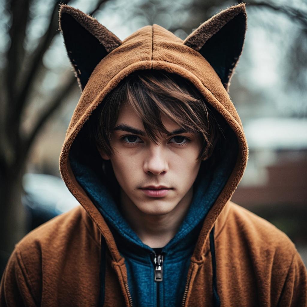 Young Man in Cat Ear Hooded Jacket