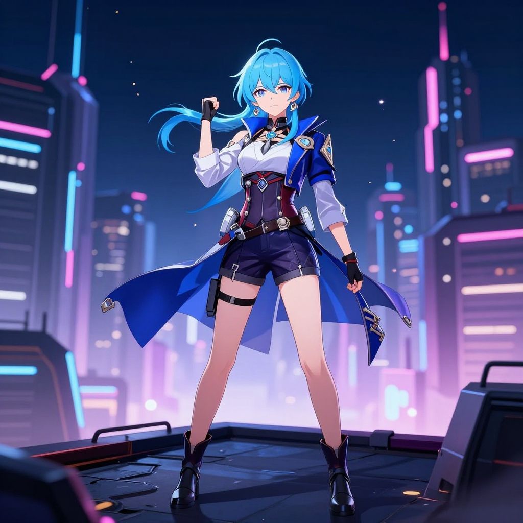 Honkai star rail blue hair guy standing on futuristic city rooftop at night, neon lights glowing, cyberpunk outfit, dynamic pose, vibrant colors, detailed character design