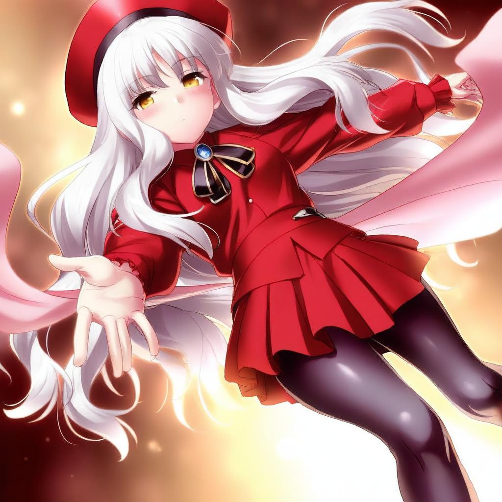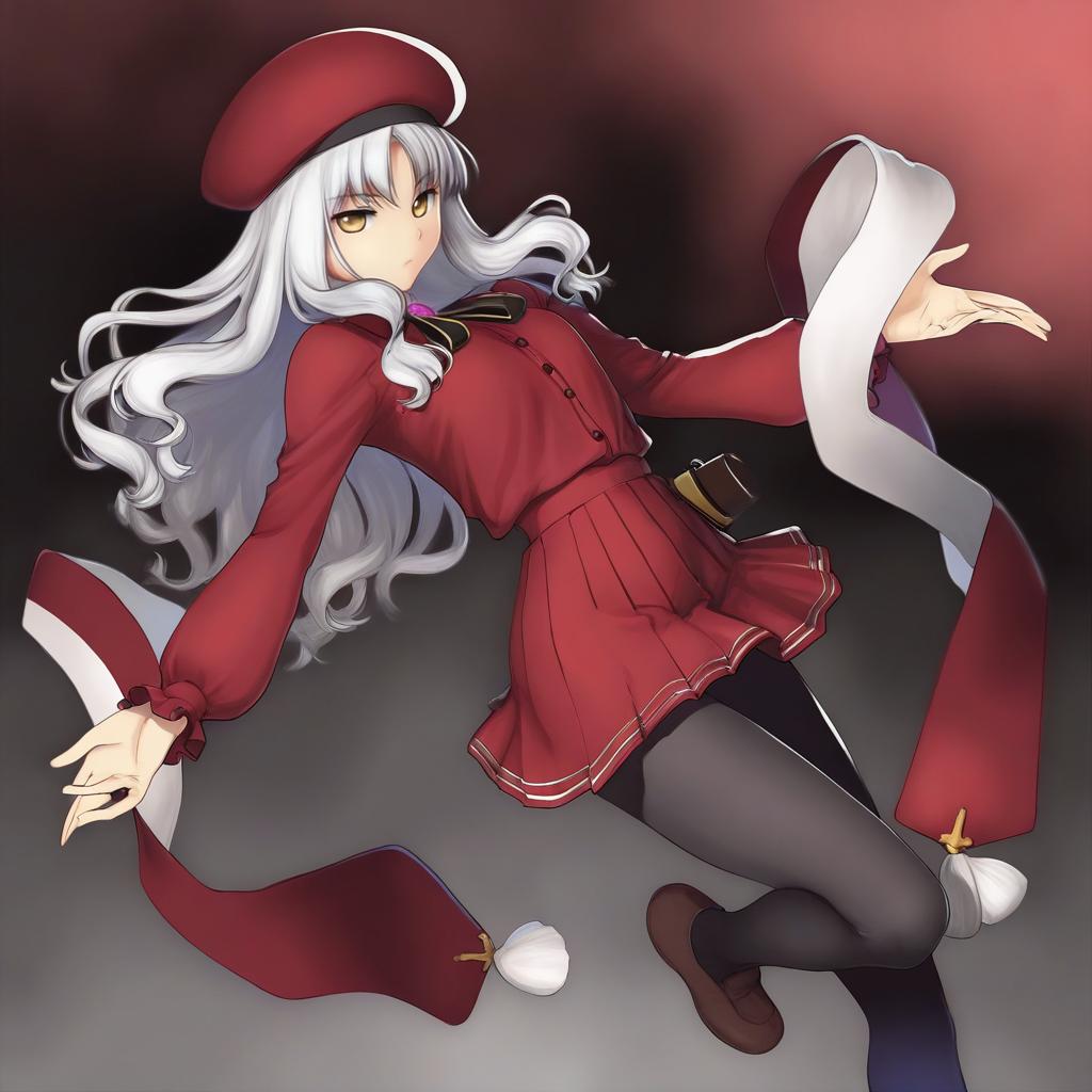 Caren hortensia (amor caren), fate (series), 1girl, yellow eyes, white hair, wavy hair, long hair, very long hair, medium breasts, thighs, red headwear, red dress, black pantyhose, long sleeves, neck ribbon, beret, brooch, shawl, by artist kago no tori, leet