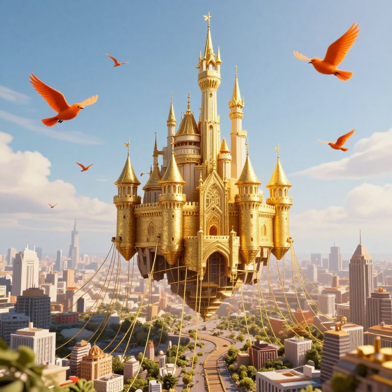 A fantastical 3D-rendered cityscape features a grand, golden castle floating above a sprawling metropolis, tethered by intricate golden threads that evoke the imagery of knowledge and dreams, with vibrant orange birds soaring through the sky, capturing the essence of a magical, otherworldly realm.
