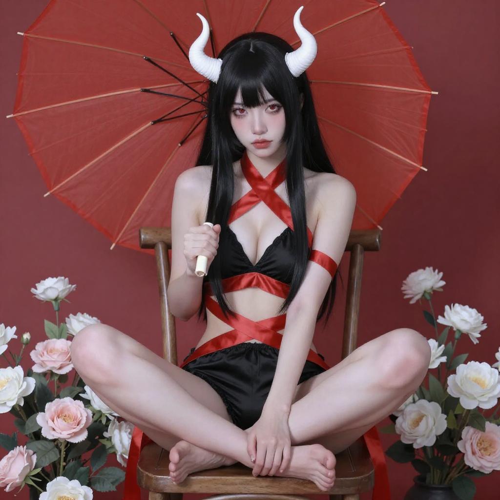 A digital image of an Asian woman in a nude cosplay, sitting on a wooden chair with legs spread. She has black hair, red and white horns, and holds a red paper umbrella. She wears red ribbons on her ankles and a partially visible blue and white outfit. Floral decorations and a wooden lattice background enhance the scene.