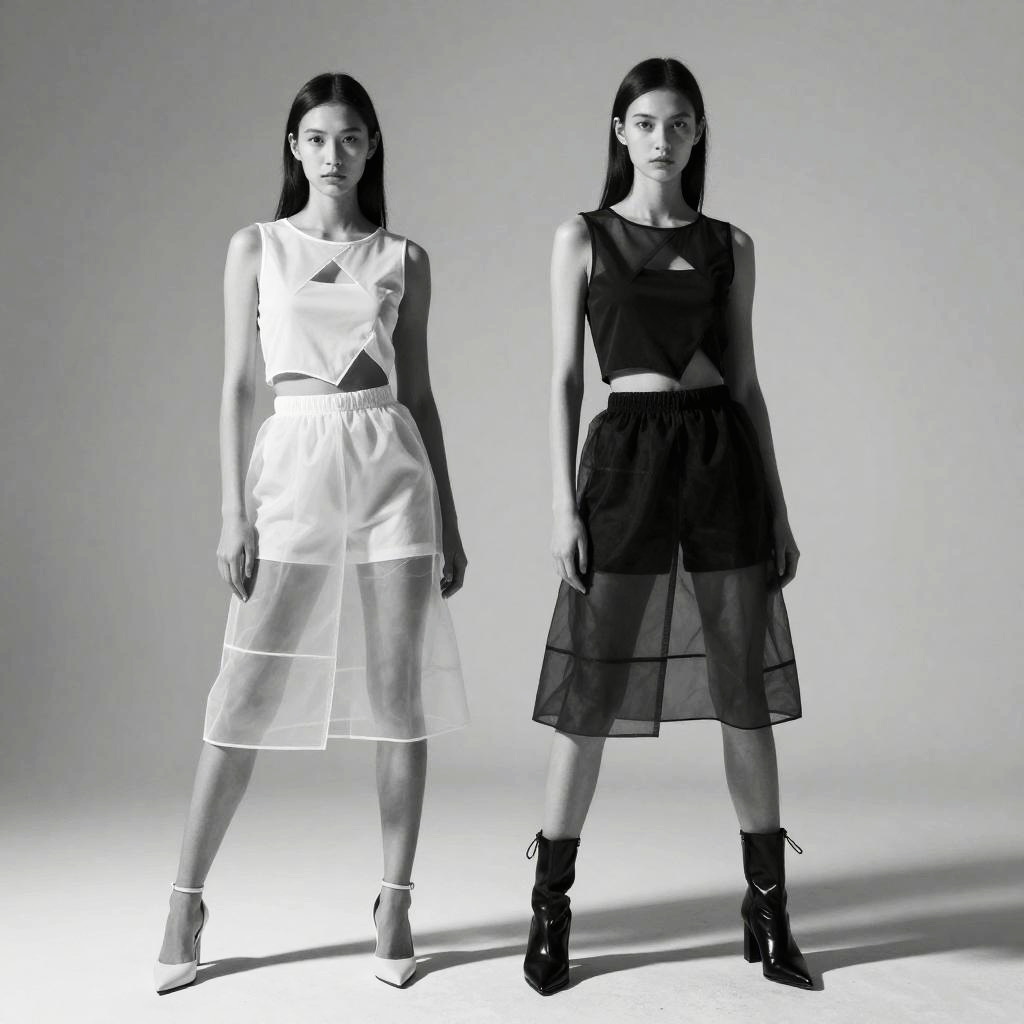 AI generated fashion editorial style image featuring minimalist yet innovative clothing designs with geometric cutouts and layered transparent fabrics, captured in a monochrome studio with sharp shadows and dynamic poses.