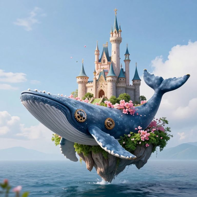 Suspended between sky and sea, a whimsical castle atop a verdant isle floats serenely upon the back of a colossal, clockwork whale, its gears whispering secrets of time and gravity, while blossoms defy gravity, blooming in a surreal dance of hope and wonder.
