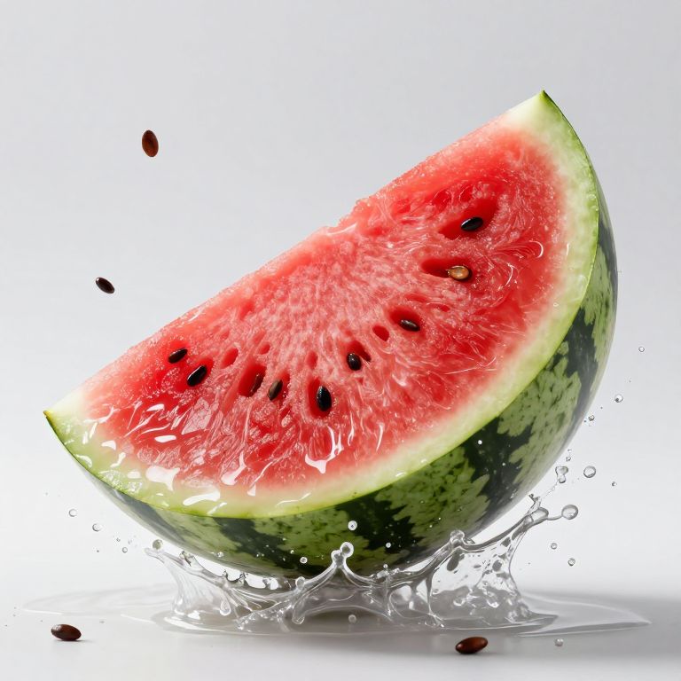 A watermelon being sliced mid-air, juice and seeds splashing in all directions, dynamic action shot, hyper-realistic style with sharp focus and vibrant colors, studio lighting highlighting the texture and freshness, energetic and refreshing scene