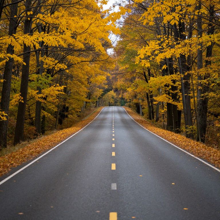 An autumnal road stretches endlessly, its yellow leaves and damp asphalt whispering tales of transience and choice, inviting travelers to ponder the weight of paths untaken and the quiet melancholy of parallel lives.