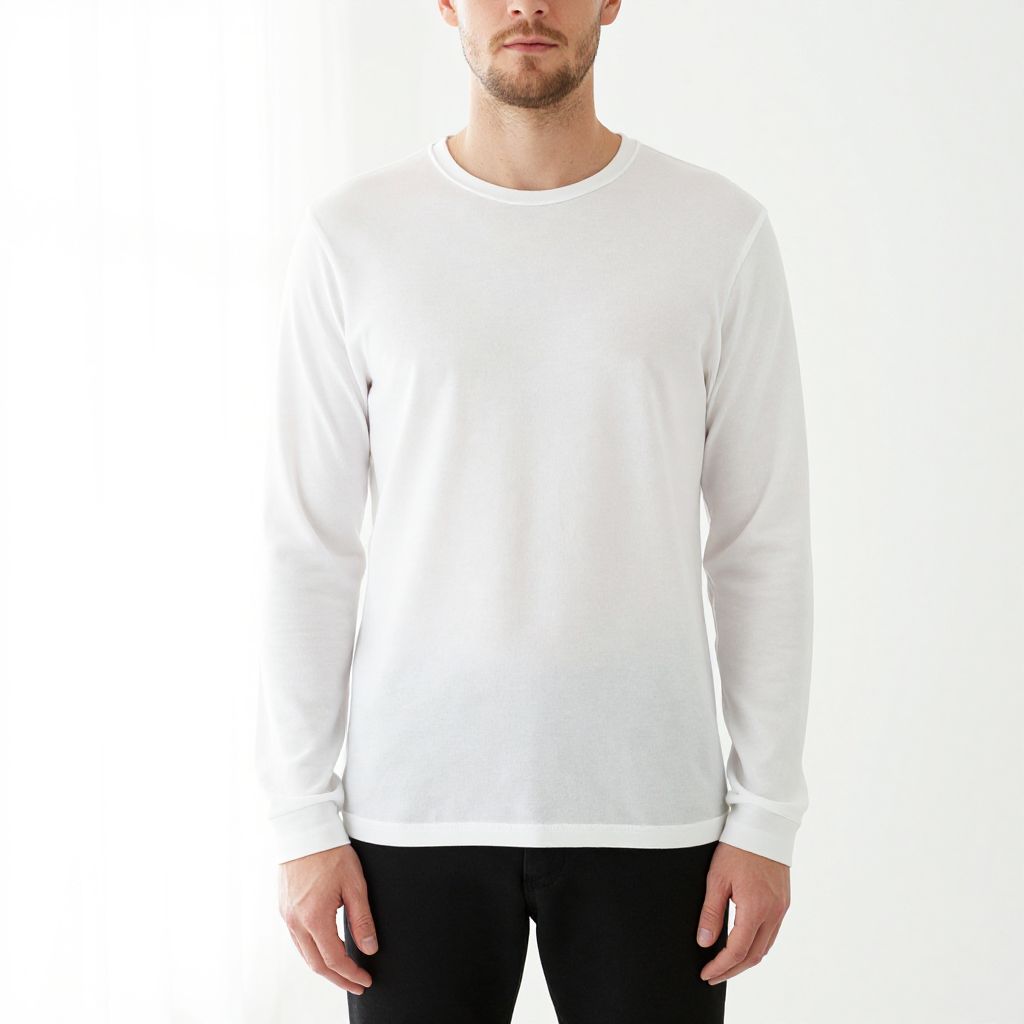 Photograph of a light-skinned man with a trimmed beard, standing against a plain white background. He is wearing a plain white, long-sleeve, crew-neck shirt and black pants. His face is partially visible, showing a neutral expression. The shirt is made of a smooth, slightly stretchy fabric, and the pants are plain with no visible patterns or textures. The image is well-lit, emphasizing the clean, minimalist look of his outfit. His arms rest naturally by his sides.