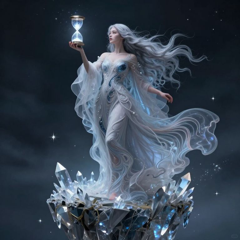 Digital artwork of a ethereal woman with flowing silver hair, wearing a translucent white gown, holding a glowing hourglass, standing on a crystal pedestal in