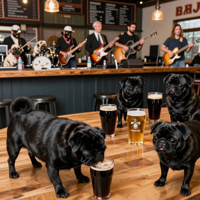 Bump Mapping a black pug drinking at a los angeles style brewery with other black pugs, theyre drinking stouts and have a band of pugs playing on the side,