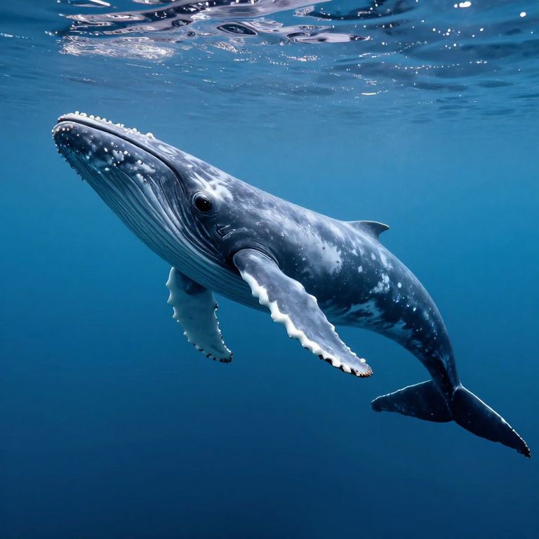Photograph of a large humpback whale swimming underwater. The whale, with its distinctive white pectoral fins and dark gray body, is angled from the right to the left. The deep blue ocean surrounds it, with sunlight filtering through the water's surface above, creating sparkling reflections. The whale's textured skin and large mouth are visible, and its tail fin is partially seen on the bottom right. The image captures the majestic and serene beauty of the whale in its natural habitat.