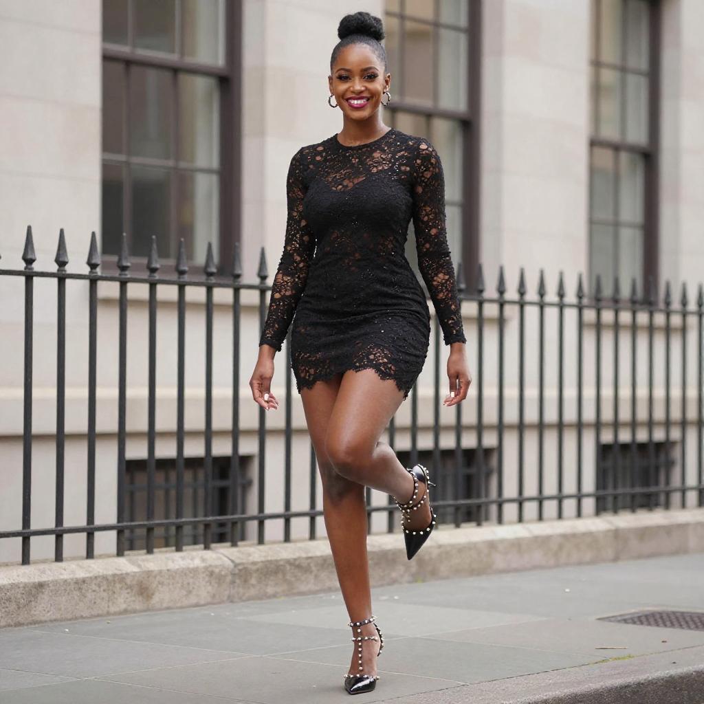 Photograph of a confident Black woman with a sleek bun, wearing a black lace long-sleeve mini dress and black studded heels, standing on one leg in a city street. She has a radiant smile and full lips. The background features a stone building with tall windows and a black iron fence.