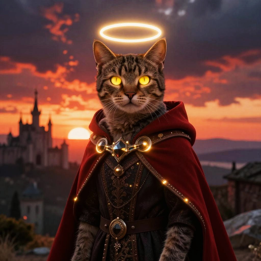 Digital artwork of a cat with glowing yellow eyes and a glowing halo, standing in a dramatic, colorful sunset landscape. The cat wears a red, glowing, ornate cloak with bright light accents and a dark, medieval-style garment underneath. The background features a distant castle and a vivid, orange-red sky with dark clouds. The cat's expression is intense and mysterious.