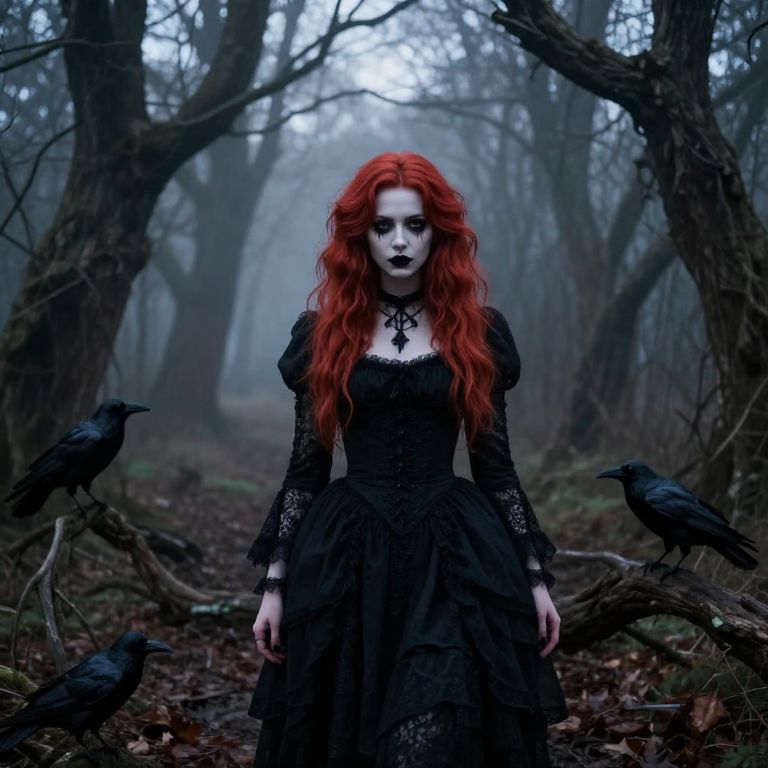 Redhead goth girl standing in a misty forest at twilight, dressed in Victorian-style black lace dress with dark makeup, pale skin glowing subtly, surrounded by ravens and twisted trees, moody and atmospheric, cinematic lighting