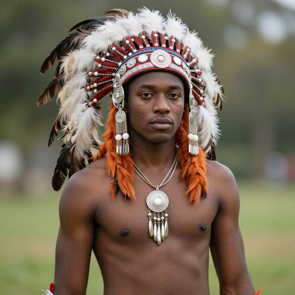 Photograph of a shirtless, dark-skinned man wearing a white and red feathered headdress with orange accents, silver necklaces, and detailed