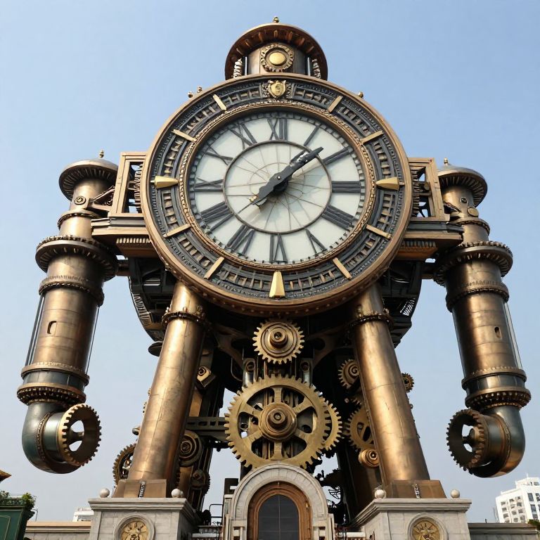 Steampunk-style clock with large brass gears, bronze columns, and a white clock face, set against a clear blue sky.