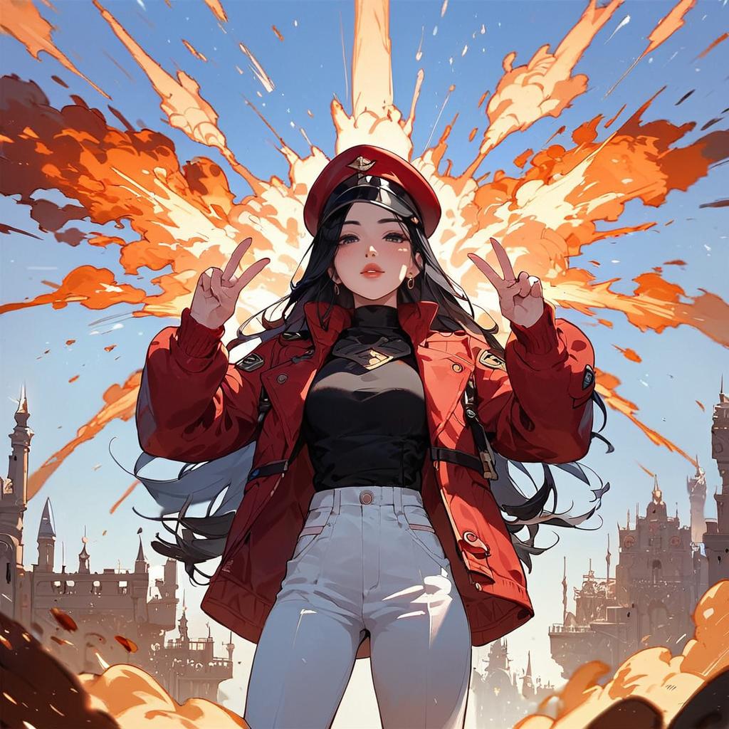 Score_9, score_8_up, score_7_up, source_anime, rating_safe, early modern soldier, 1 girl, solo, long black hair, white pants, red jacket, red hat, ahebomb, explosion, european castle, double v