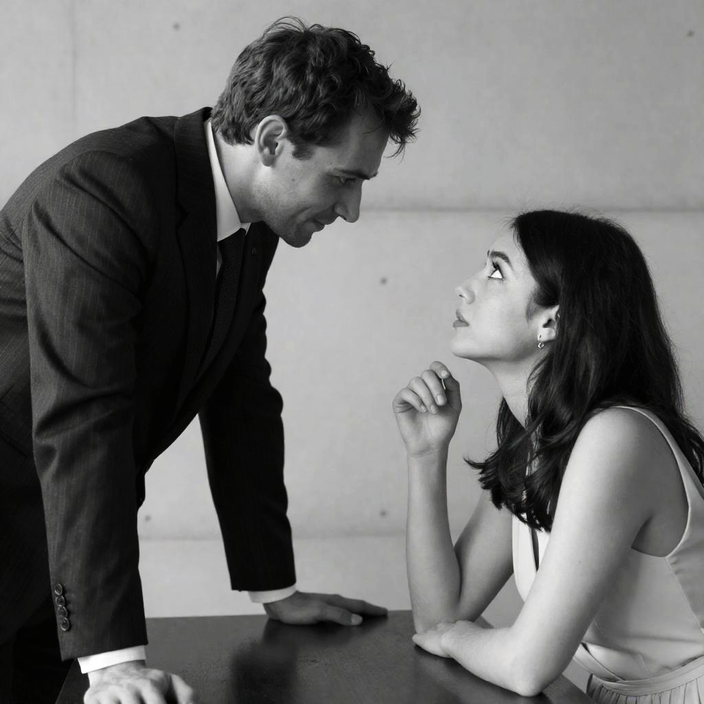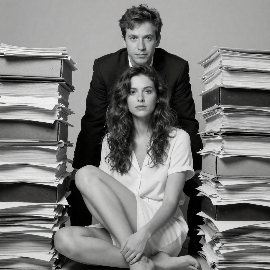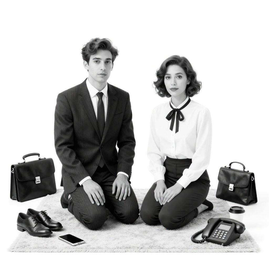 Black and white drawing of two people kneeling on a rug. Man in pinstripe suit, woman in bow-tie blouse. Both with short, wavy hair. Surrounding objects: shoes, briefcase, phone, coffee cups, corded phone, bag. Neutral expressions.