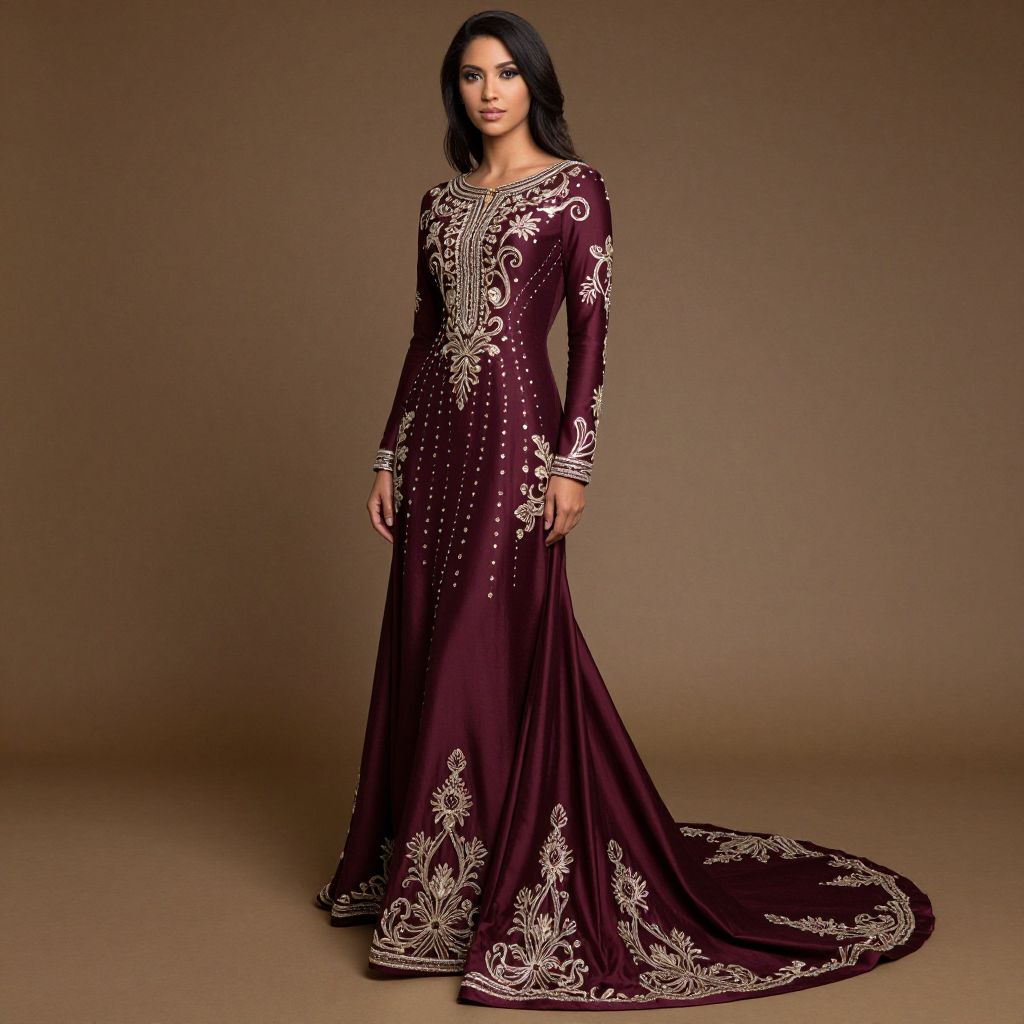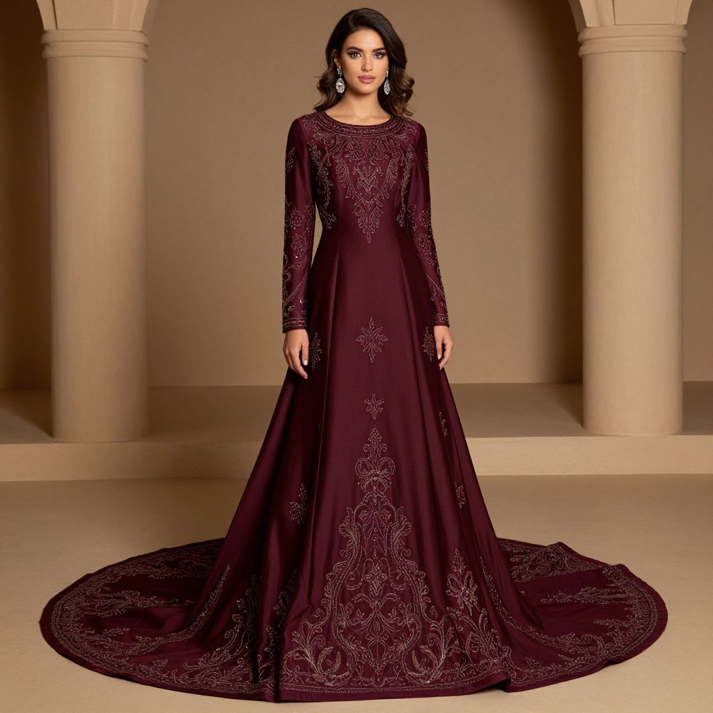Elegant South African woman showcasing a luxurious burgundy evening gown featuring long sleeves, intricate appliqué detailing, and a sweeping train, embodying the essence of Arabic-inspired fashion for formal events in 2019.