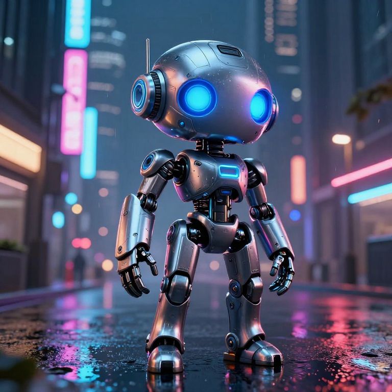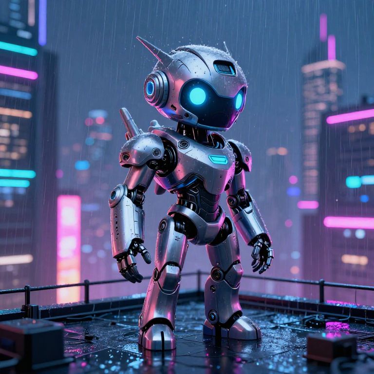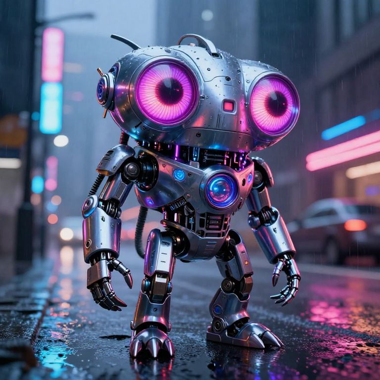 Futuristic four eyed creature with cybernetic enhancements, metallic skin reflecting neon city lights, standing on a rainy street, sci-fi concept art