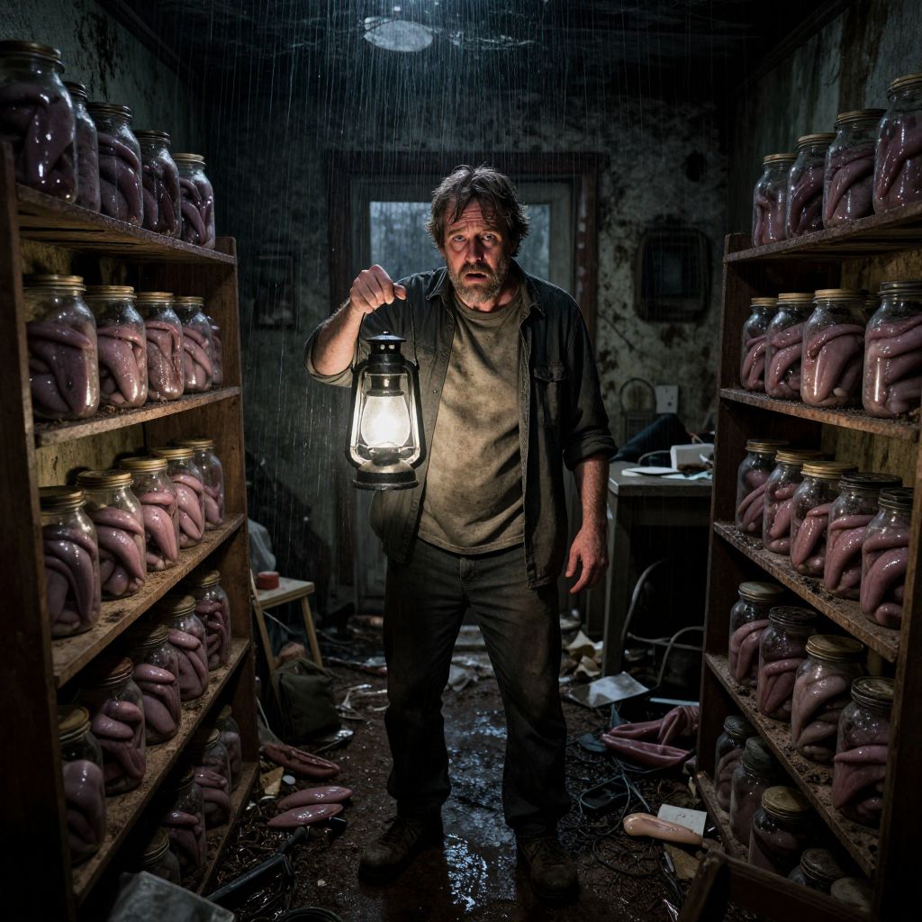 In a dark, run-down cabin, a distraught 45-year-old man stands in a large, cluttered room filled with disgusting jars of tongues. The cabin is set in South Carolina, with rain falling outside, adding to the eerie atmosphere. The man, with a beard and a distressed expression, holds a lantern, casting a flickering light on the surrounding disarray. The room is filled with shelves lined with jars, each containing what appears to be human tongues, creating a sense of horror and unease. The walls are covered in dirt and grime, and the floor is strewn with debris, contributing to the overall sense of decay and neglect. The lighting is dramatic, with shadows playing across the man's face and the jars, enhancing the terrifying and spooky mood of the scene. The composition is tightly framed, focusing on the man and the jars, while the background remains dark and indistinct, keeping the viewer's attention on the central figure and the unsettling subject matter.