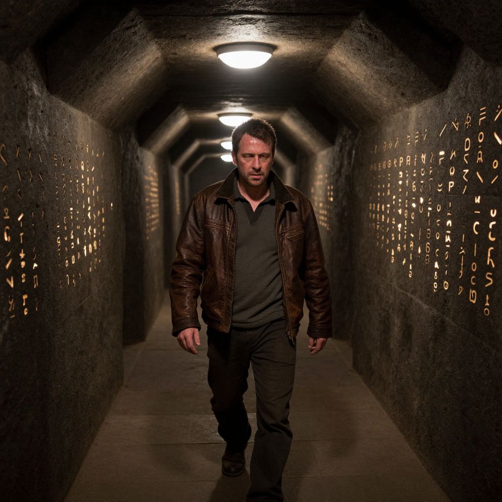 Photograph: A rugged, bearded man with messy brown hair stands in a dimly lit, rain-soaked room, holding a lantern, surrounded