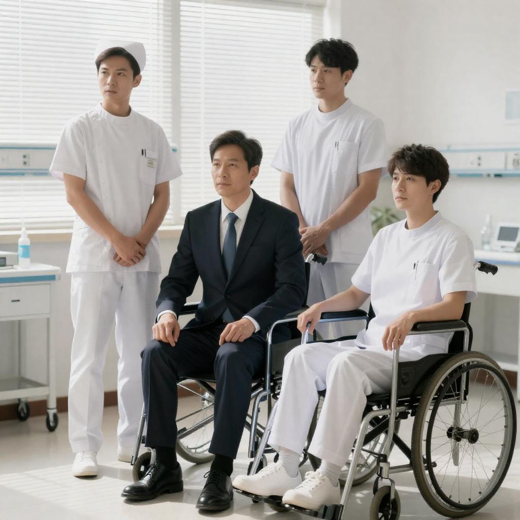 Photograph of four men in a hospital room. Three men in white nurse uniforms stand behind a seated man in a dark suit. Another man in a white nurse uniform sits in a wheelchair to the right. Sunlight filters through blinds.