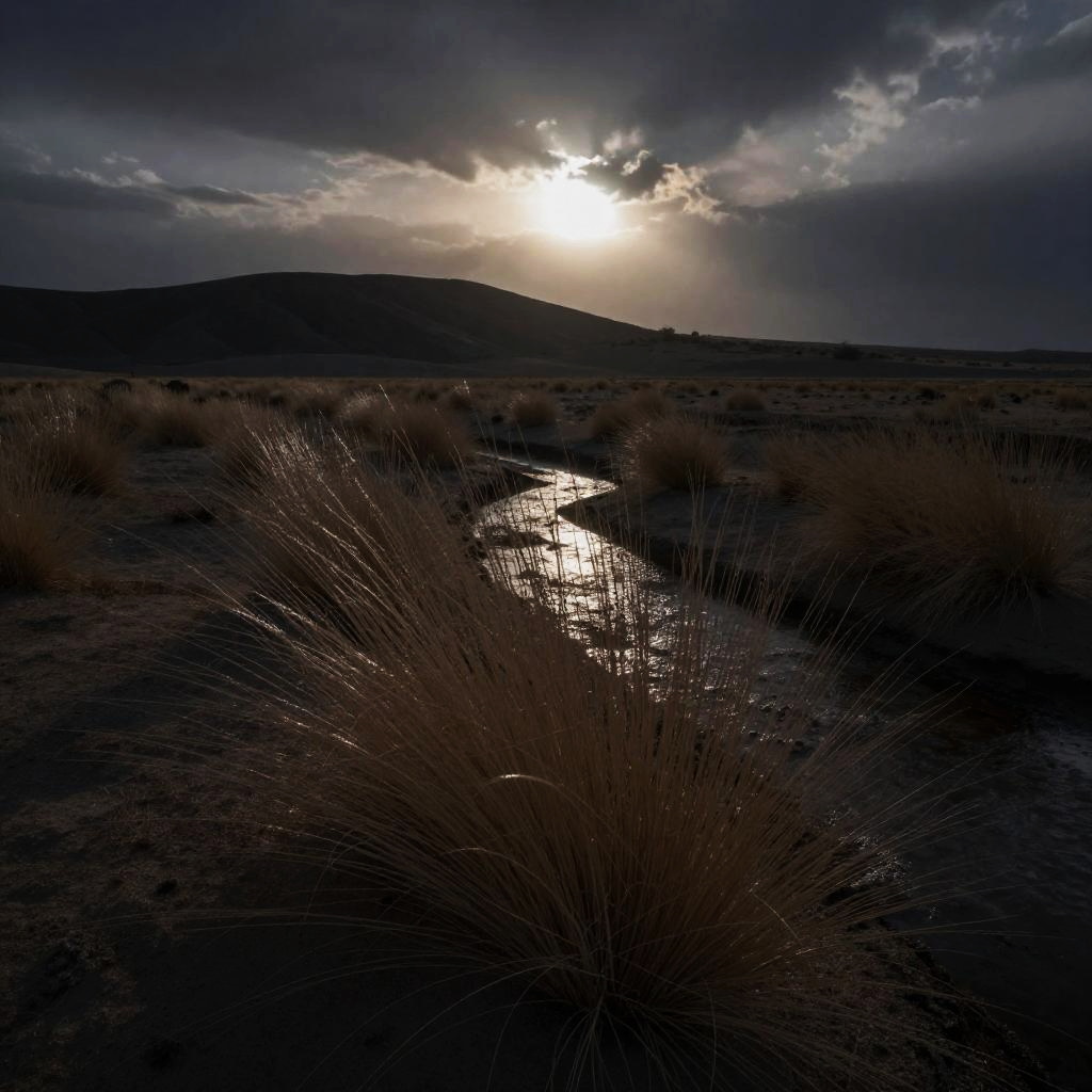 This is a moody, dark photograph of a desert landscape at dusk. The foreground has tall, dry grasses with a shiny, reflective texture, leading to a shallow, glistening stream. In the background, a dark, rolling hill rises under a cloudy sky with a bright, partially obscured sun breaking through. The overall color palette is muted and dramatic, with deep shadows and highlights.