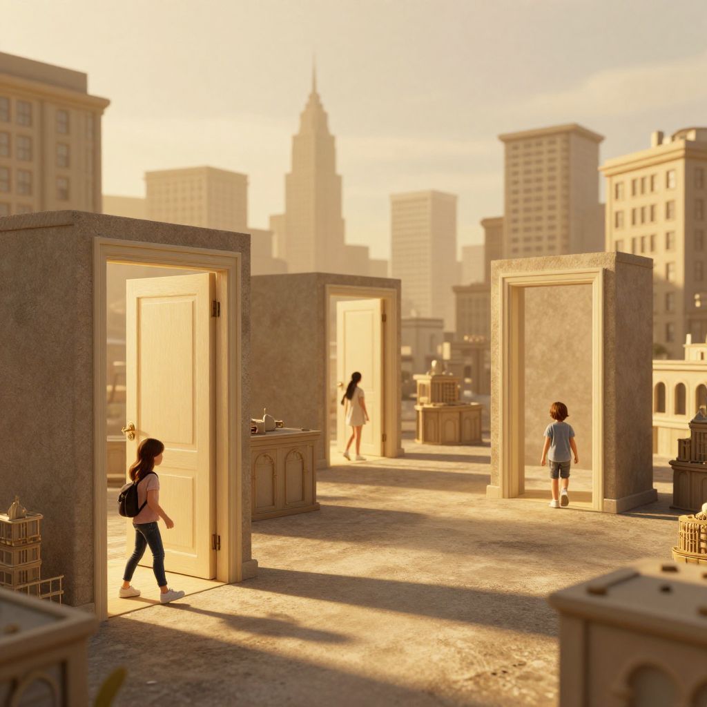 In a surreal 3D-rendered environment bathed in golden-hour lighting, two figures—a woman and a child—walk through a series of interconnected doorways, defying conventional spatial boundaries in a cityscape where architecture transcends reality.