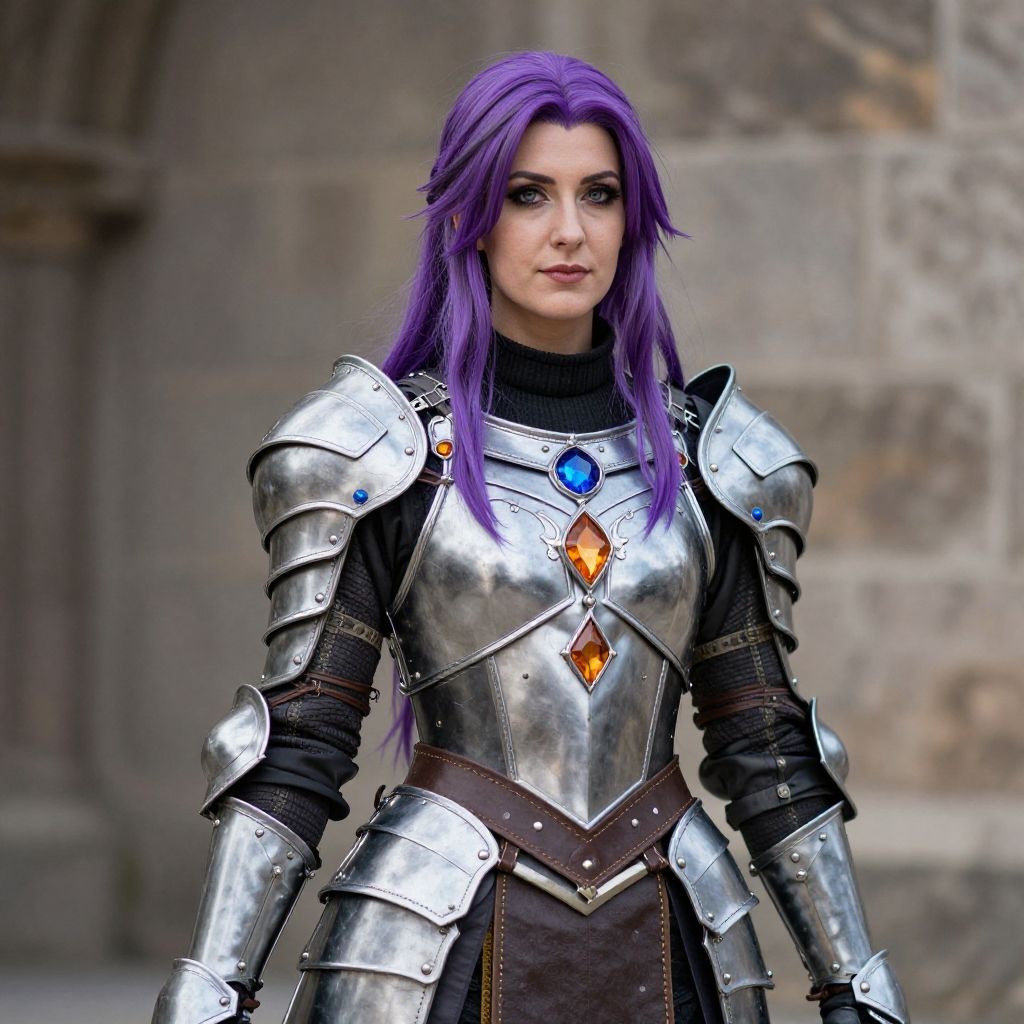 Photorealistic digital painting of a purple-haired woman in silver medieval armor with blue and orange gemstones, standing in front of a stone wall.